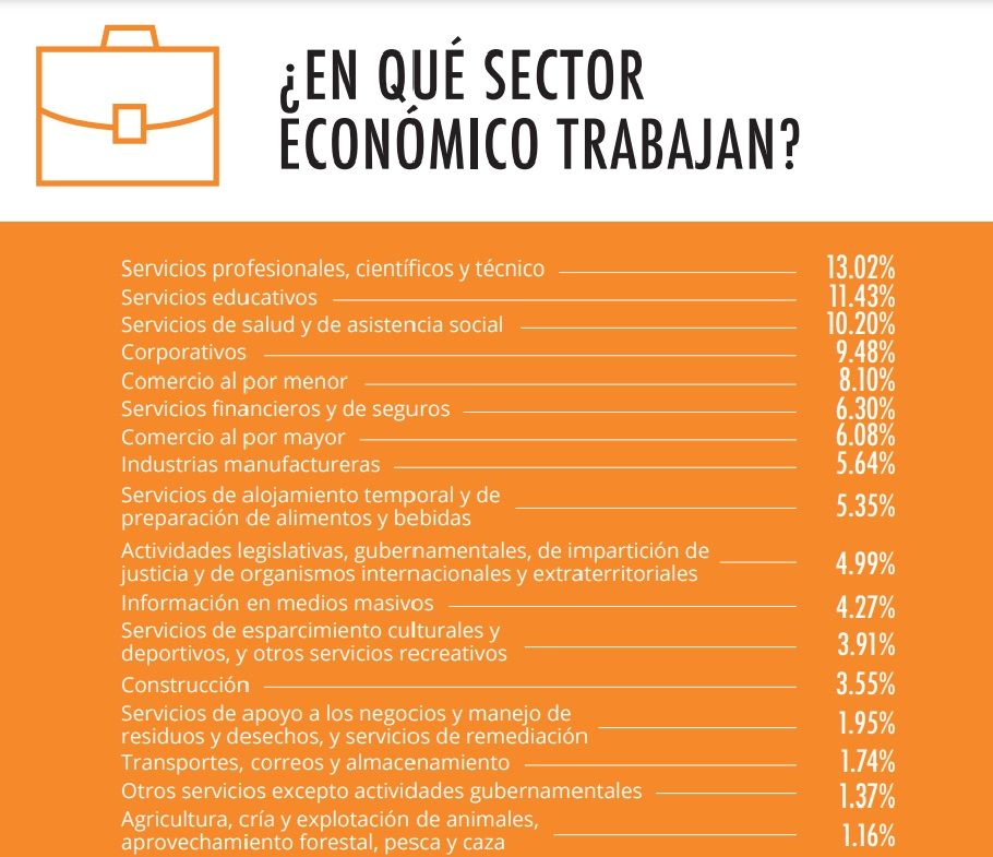 5. El 35% de las personas LGBTQ+ trabajan en tres sectores: 1) Servicios profesionales, científicos y técnicos; 2) Servicios de Salud; 3) Servicios de asistencia social.